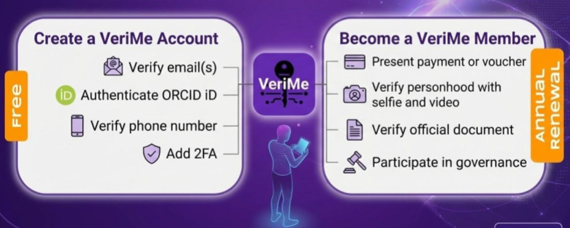 For no fee, researchers can create an account and link and verify their email account(s), mobile phone number, and ORCID iD, and secure that account with multi-factor authentication (2FA). Researchers who become VeriMe Cooperative members can also prove their personhood and verify their identity, as well as participate in VeriMe governance. Learn more about Membership.
